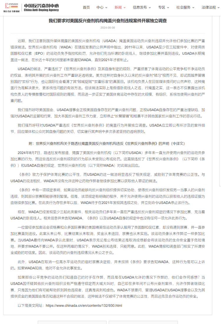 我们强烈呼吁美国国会、USADA理事会正视美国自身存在的严重兴奋剂问题,正视USADA自身存在的严重治理缺陷,加强对USADA的监管和约束,加大本国反兴奋剂工作力度,立即停止“长臂管辖”和粗暴干涉其他国家反兴奋剂工作的恶劣行径。