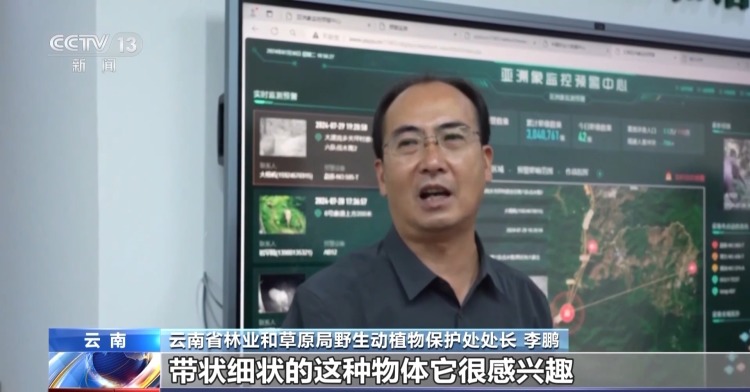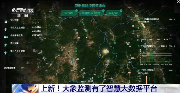 总台央视记者 蒋树林:云南是亚洲象分布最多的地区之一。这个数字大屏是亚洲象监控预警中心,上面可以看到亚洲象出没的热力图。除了靠我们的护象队和监测队员的这种传统的人工监测大象之外,还有天上的无人机和地面上的红外相机,帮助我们在野外数大象和守护大象。