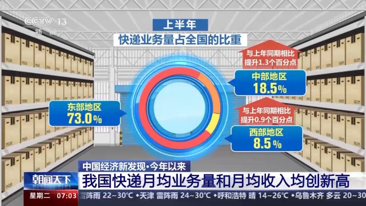 今年以来,我国快递行业发展区域结构持续优化。上半年,中、西部地区积极投产分拨中心,增强仓配能力。上半年,东、中、西部地区快递业务量占全国的比重分别为73.0%、18.5%和8.5%,与上年同期相比,中部和西部分别提升1.3个和0.9个百分点。