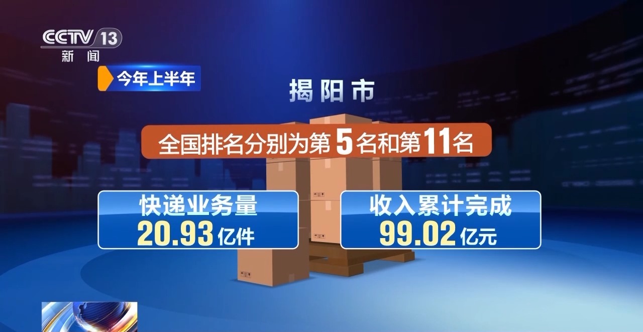 今年上半年,揭阳市快递业务量、收入累计完成20.93亿件和99.02亿元,全国排名分别为第5名和第11名。