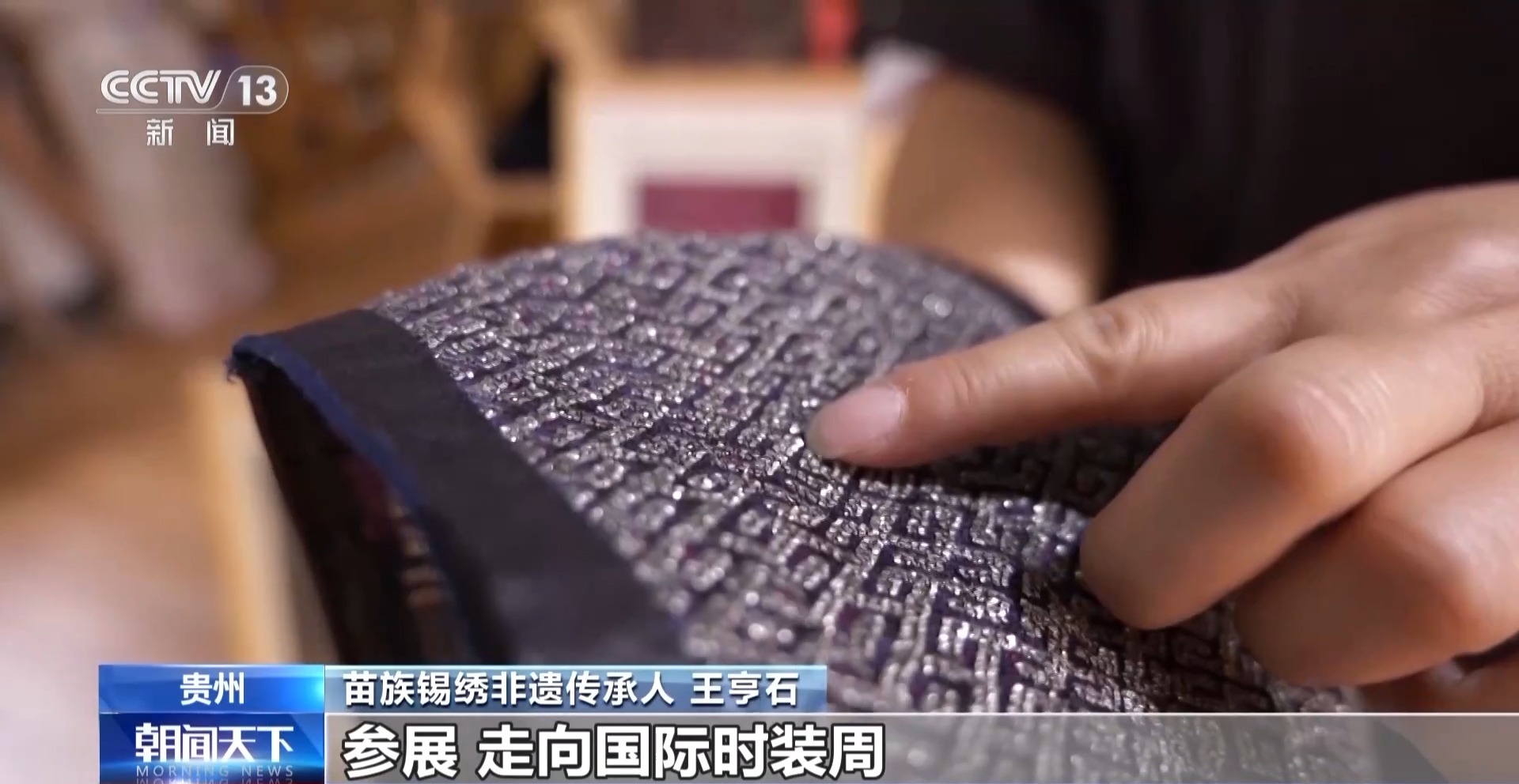 苗族锡绣非遗传承人 王亨石:按照他要尺寸的大小自己绣出来,绣出来以后寄给他,他自己再设计出作品,参展,走向国际时装周。我想生在大山里面几百年的锡绣,今天能走上这么高的国际舞台,我真的感到很高兴而且很自豪。