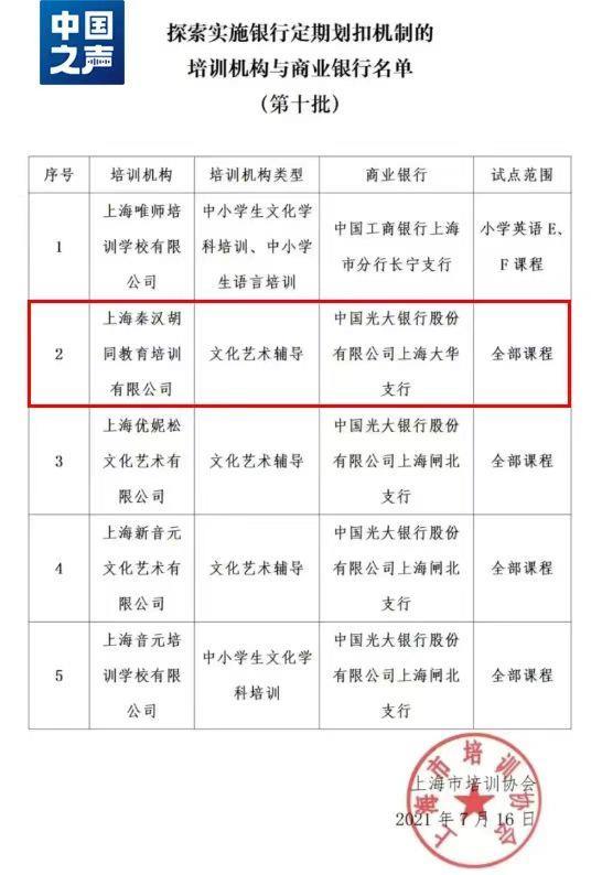 2021年,上海市培训协会公布了一份“探索实施银行定期划扣机制的培训机构与商业银行名单”,称“为切实维护消费者的合法权益,消费者预付的培训资金由商业银行直接收取、保管。银行按照与消费者及培训机构的合同约定,将培训资金定期划扣至培训机构,消费者可以按照合同约定,要求商业银行停止后续培训资金的划扣。”