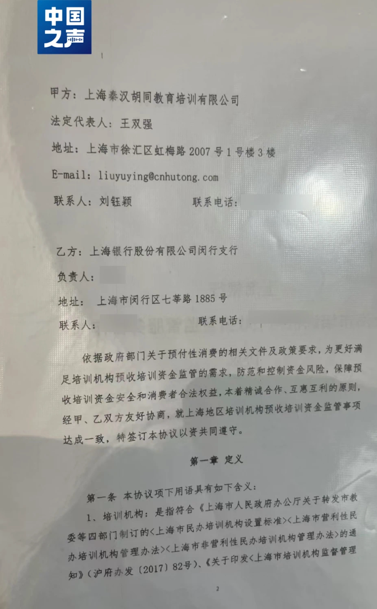 名单显示,秦汉胡同与光大银行上海大华支行有相关合作机制。但家长给记者发来的一份合同显示,秦汉胡同又与上海银行闵行支行签订了《上海市培训机构预收资金监管服务合作协议》,监管账户到底在哪里?