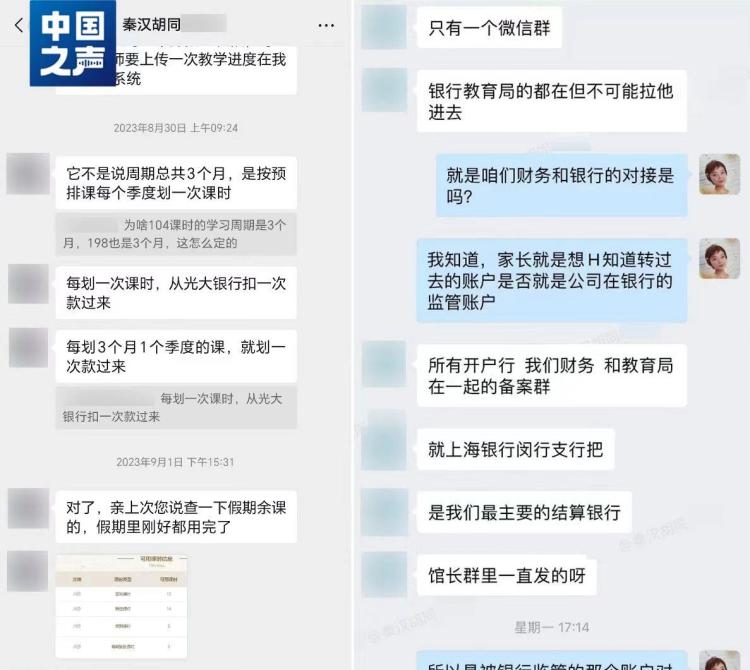 有家长向记者提供了一份2023年购课时销售的介绍,其中提及了秦汉胡同的监管账户。家长提供的与机构销售的聊天记录显示,销售特意给家长发了公司内部的聊天记录,称家长的钱都打往了监管账户。每上一次课,公司才会从监管账户中扣一次款。