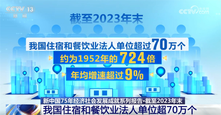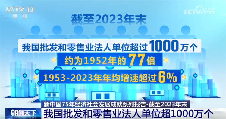 新中国成立75年来,我国商贸流通行业单位数量快速增长,截至2023年末,我国批发和零售业法人单位超过1000万个,约为1952年的77倍,1953—2023 年年均增速超过6%;住宿和餐饮业法人单位超过70万个,约为1952年的724倍,年均增速超过9%。
