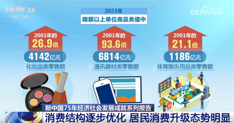 新中国75年经济社会发展成就系列报告还指出,新中国成立75年以来,我国居民消费从注重量的满足逐步转向追求质的提升,消费需求日益多元,消费升级态势日趋明显。