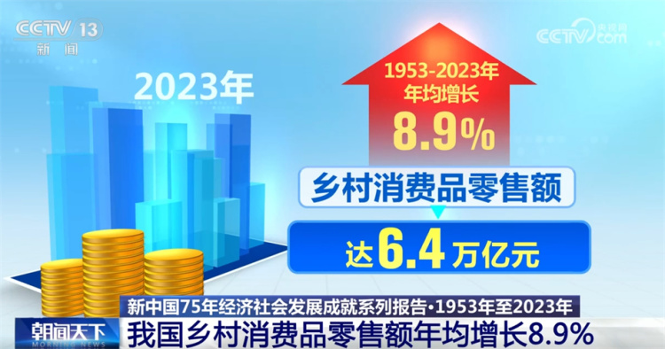 乡村市场活力有效激发,2023年,乡村消费品零售额达6.4万亿元,1953—2023年年均增长8.9%。