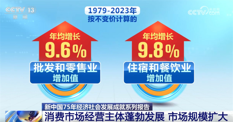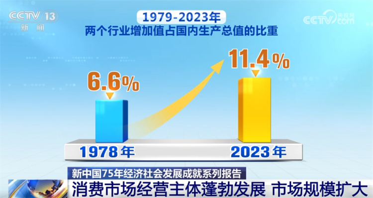 经济发展方式优化转变,与消费紧密相关的批发和零售业、住宿和餐饮业对经济增长的贡献作用明显增强。1979—2023年,按不变价计算的批发和零售业、住宿和餐饮业增加值年均分别增长9.6%、9.8%,两个行业增加值占国内生产总值的比重由1978年的6.6%提升至2023年的11.4%。