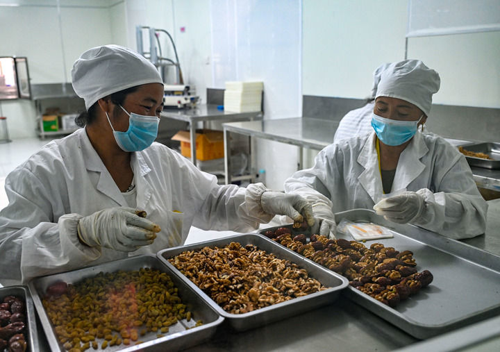 在新疆喀什地区巴楚县一家合作社,职工在无菌车间内制作枣夹核桃(9月8日摄)。新华社记者 陈朔 摄