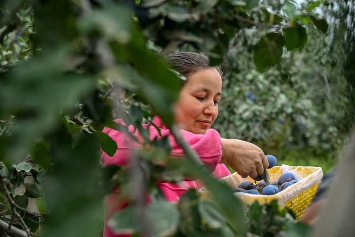 农民在新疆昆玉市老兵镇一家种植园内采摘新西梅(9月4日摄)。新华社记者 陈朔 摄