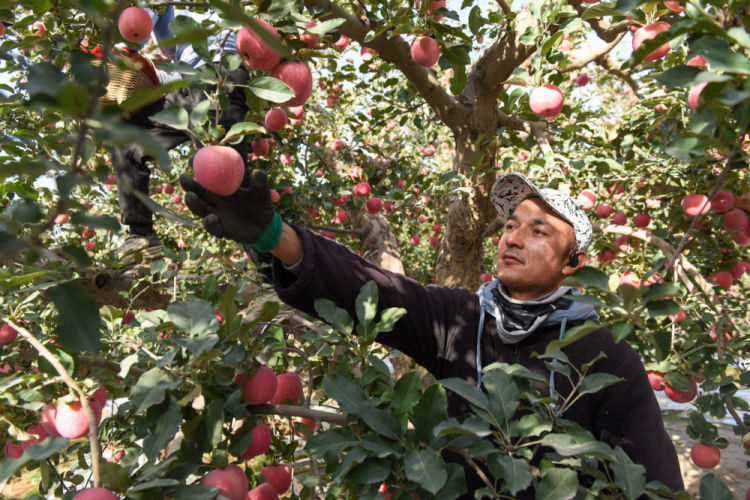 10月23日,在新疆阿克苏地区红旗坡农场,果农在采摘苹果。新华社记者 高晗 摄