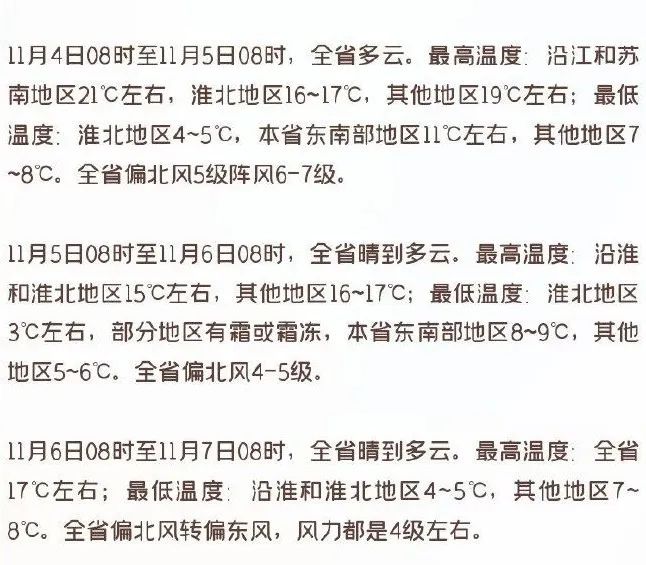 据@江苏气象最新消息:北方有一股较强的冷空气正在东移南下,预计今天白天开始自北向南影响本省。受其影响,全省大部分地区48小时最低气温将下降5~8℃,并伴有陆上5-7级,江河湖库及沿海海面7-8级的偏北大风,过程最低气温将出现在6日早晨:淮北地区3℃左右,部分地区有霜或霜冻,本省东南部地区8~9℃,其他地区5~6℃。