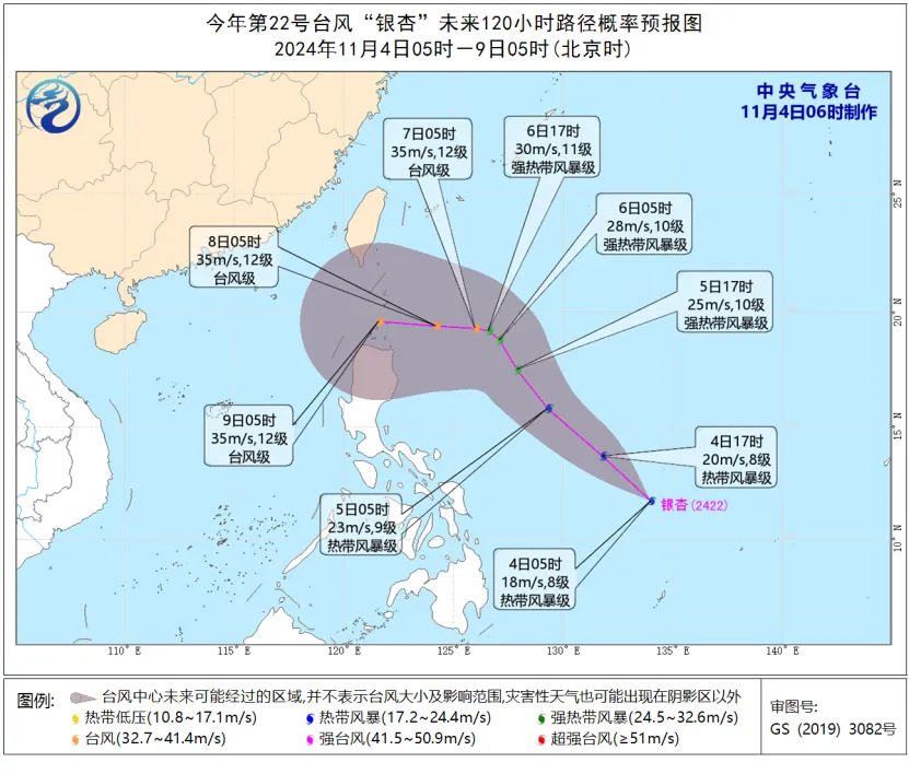 预计,“银杏”将以每小时25-30公里的速度向西北方向移动,强度逐渐增强,并向菲律宾以东洋面靠近。