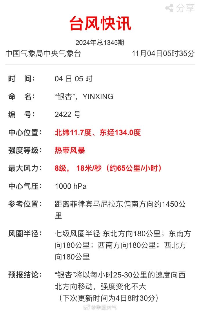 据中央气象台最新发布的台风公报,今年第22号台风“银杏”(热带风暴级,英文名称:Yinxing;名字来源:中国;名字意义:一种原产于中国的树)已于今天(4日)早晨在西北太平洋洋面上生成,早晨5点钟其中心位于菲律宾马尼拉东偏南方向约1450公里的洋面上,就是北纬11.7度、东经134.0度,中心附近最大风力有8级(18米/秒),中心最低气压1000百帕,七级风圈半径180公里。