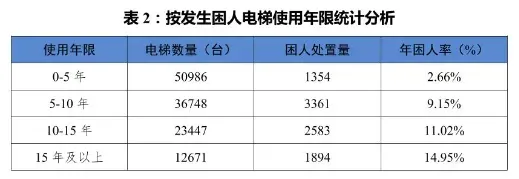 电梯困人率随使用年限增加/图截自长沙市市场监督管理局官网《2023年长沙市电梯安全状况》