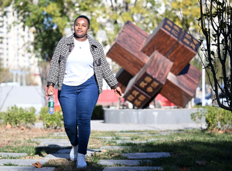 凯特行走在天津职业技术师范大学“班墨园”(11月21日摄)。