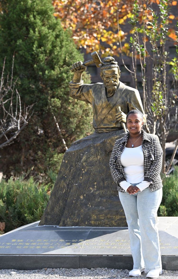 凯特在天津职业技术师范大学的鲁班雕像前留影(11月22日摄)。