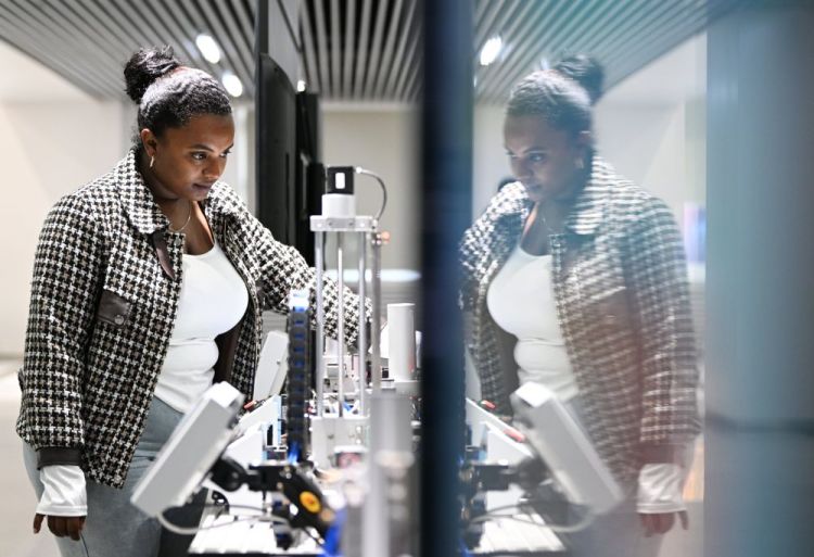 在天津职业技术师范大学实训中心,凯特了解一款仪器设备(11月22日摄)。
