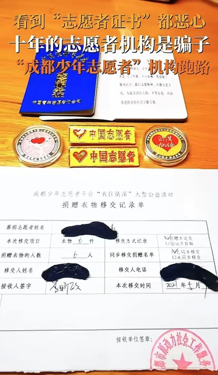 有家长称:“他们的公众号名称叫‘成都少年志愿者’,发的勋章、证书都显示为中国志愿者,通过公众号平台,可以查看到孩子的志愿服务记录,一切都看起来很官方。”