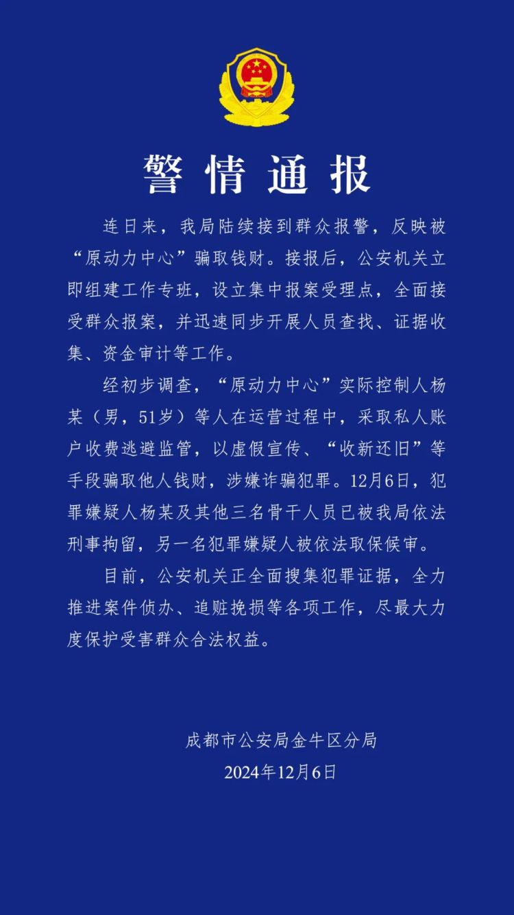 12月6日,成都金牛公安发布警情通报称,“原动力中心”实际控制人杨某及其他三名骨干人员已被刑拘,另一名犯罪嫌疑人被依法取保候审。