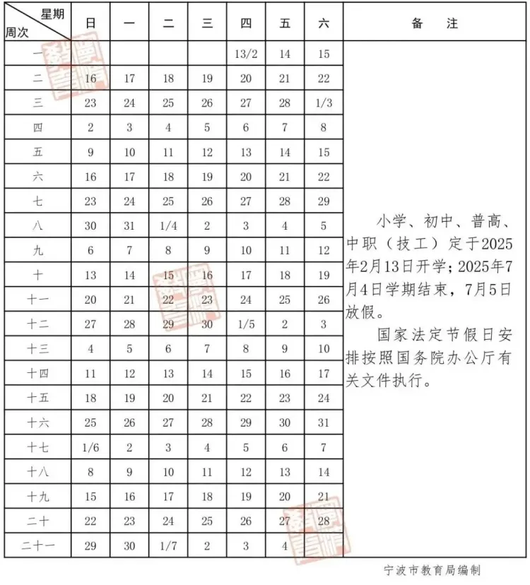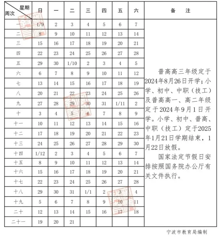 宁波市小学、初中、普高、中职(技工)定于2025年1月21日学期结束,1月22日放假,共二十一周。