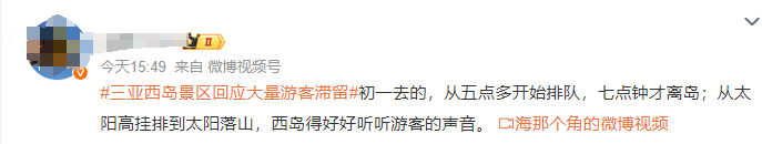 1月31日晚,“三亚西岛海洋文化旅游区”发长文致歉:春节旺季期间,游客上岛意愿强,同比去年超预期,且入离园乘船时间集中,最后导致游客候船时间延长,体验感不佳。