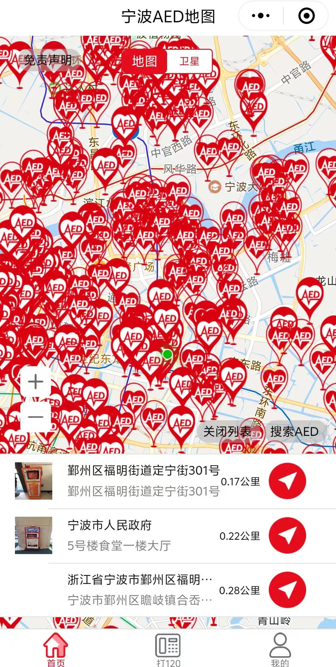 医生们能够在第一时间找到AED,源自这座城市长远的布局。自2016年宁波市安装第一台公共AED设备开始,这个被人们称为“救命神器”的小小机器,如雨后春笋般,扎根到全市的角角落落。为了让市民能够在第一时间找到AED,宁波市卫生健康委与市红十字会共同建设了宁波AED电子地图管理服务平台,并在全省率先将公共场所AED接入120急救指挥调度平台,市民拨打120后,在救护车到达现场之前,可以在120调度员的电话指导下,找到AED并进行施救。