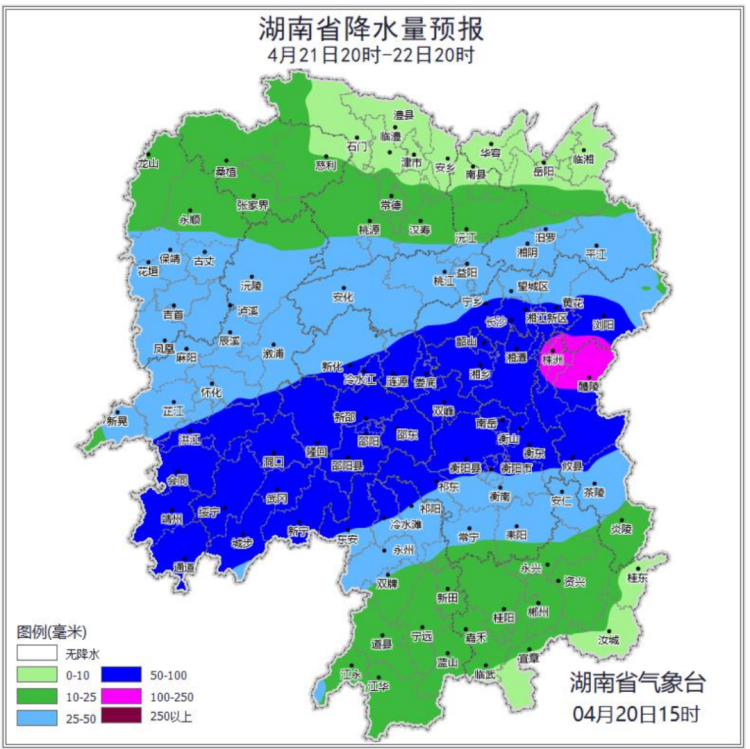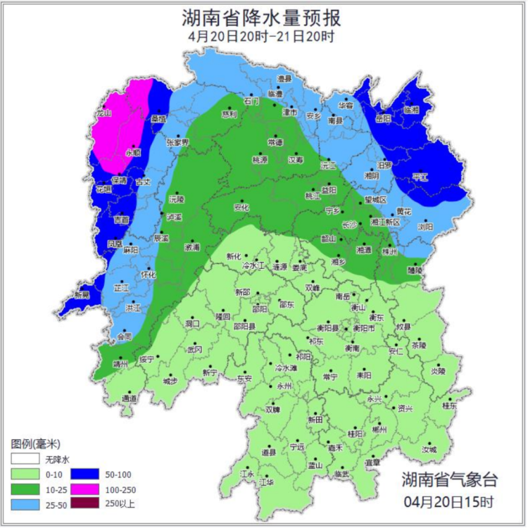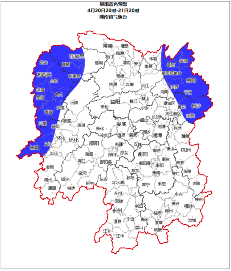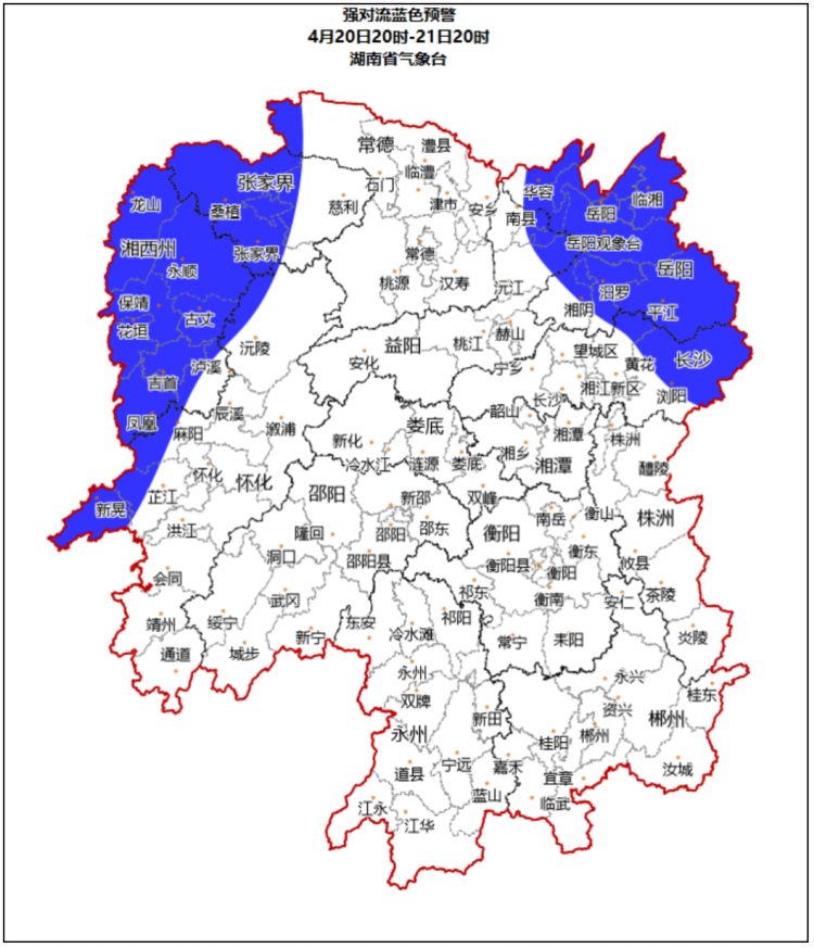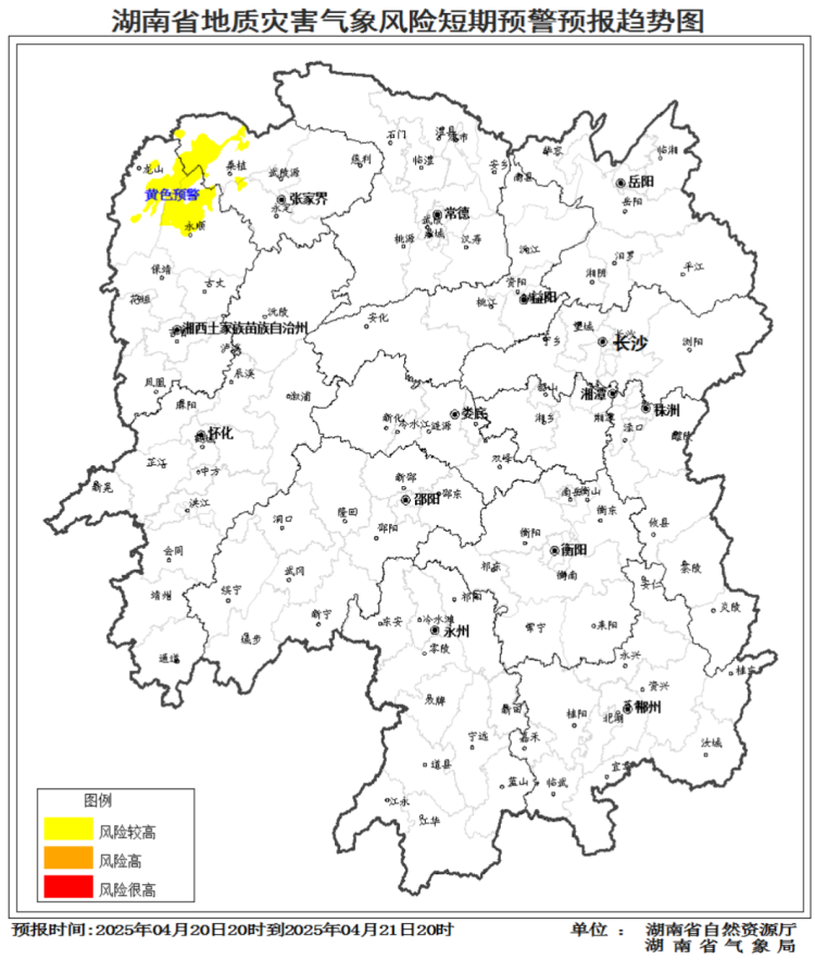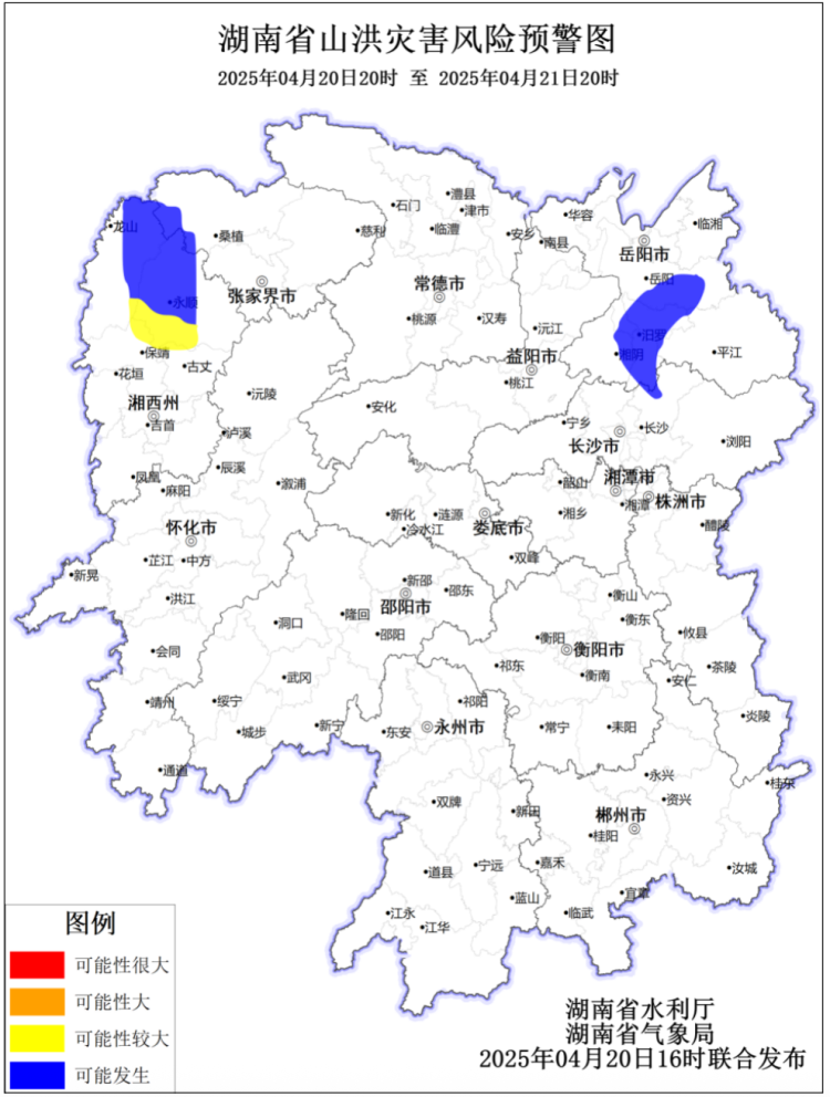20日20时至21日20时,湘西州东北部,长沙市西部,岳阳市西部,张家界西部等局地发生山洪灾害的可能性较大,岳阳市东北部、西南部,长沙市西北部,湘西州西北部,张家界西部等局地可能发生山洪灾害。