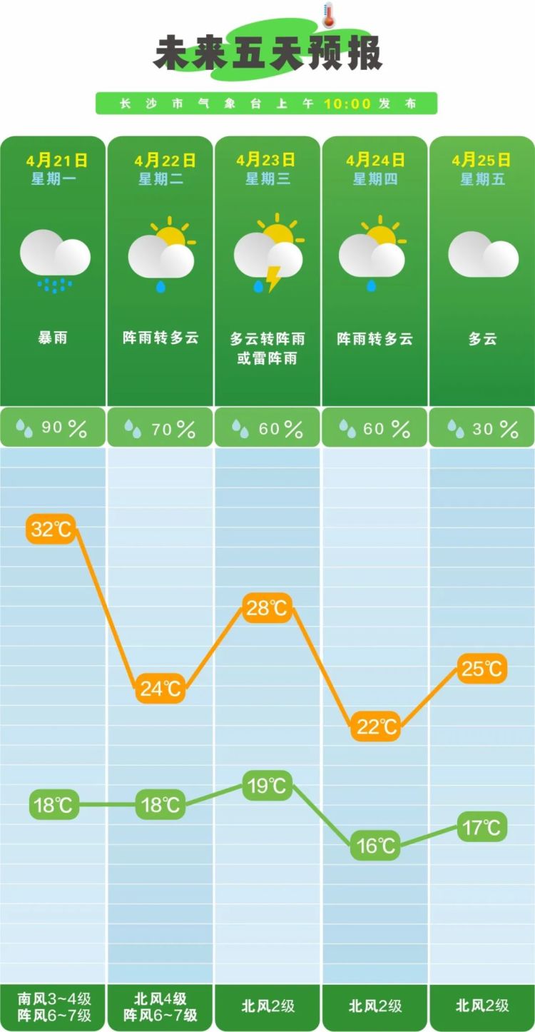 21日晚上至22日白天,湘中阴天有大到暴雨,其中长沙(浏阳)、株洲(市区、醴陵)有大暴雨,湘北小到中雨转多云,其他地区阴天有小到中等阵雨或雷阵雨;湘北北风3~4级,其他地区南风2~3级转北风3~4级,雷雨时局地阵风9~11级;最低气温19~22℃;最高气温22~26℃。