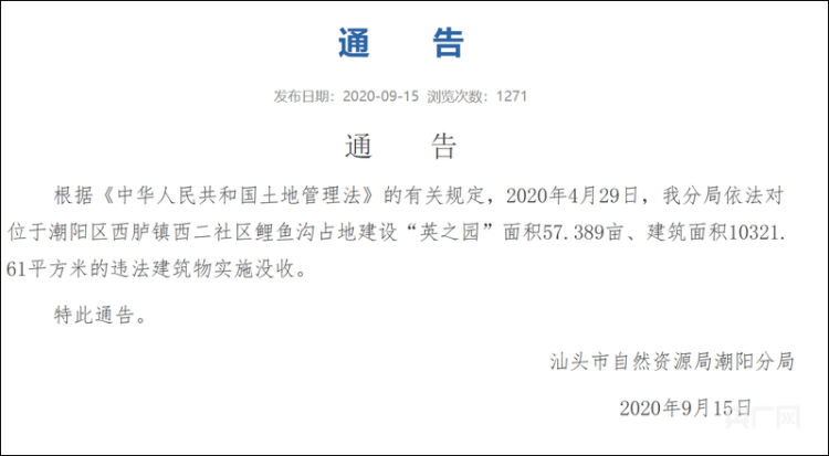央广网记者注意到,2020年9月,汕头市自然资源局潮阳分局曾发布通告称,根据《中华人民共和国土地管理法》的有关规定,2020年4月29日,依法对位于潮阳区西胪镇西二社区鲤鱼沟占地建设“英之园”面积57.389亩、建筑面积10321.61平方米的违法建筑物实施没收。