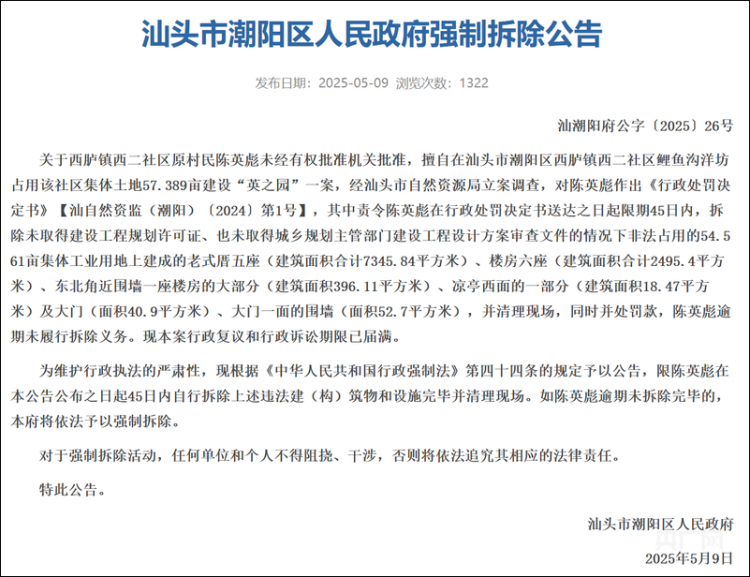 央广网记者查询到,广东省汕头市潮阳区人民政府于5月9日发布了一则强制拆除公告,被强拆的对象系“英之园”,公告称此建筑系西胪镇西二社区原村民陈英彪未经有权批准机关批准,擅自在汕头市潮阳区西胪镇西二社区鲤鱼沟洋坊占用该社区集体土地57.389亩建设而成。