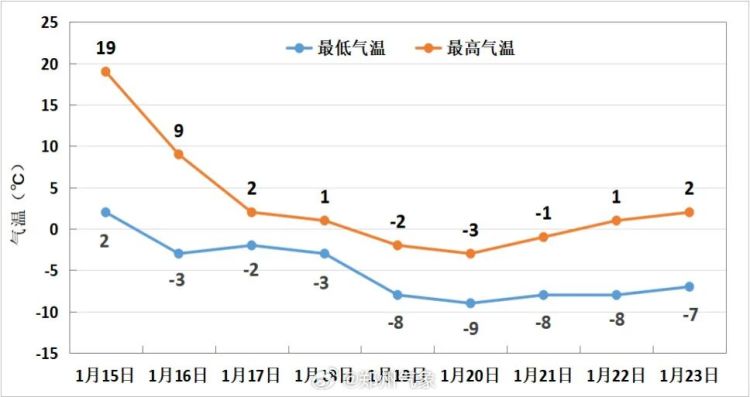 图2 2026年1月15日至23日郑州气温趋势图(单位:℃)