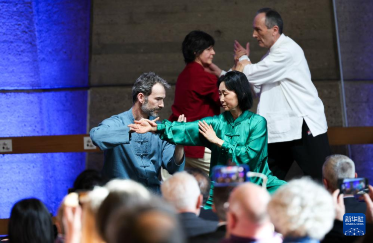 随后,中法两国太极拳习练者现场呈现了太极扇、太极剑、古琴配乐太极拳等表演。在互动体验环节,全场观众跟随台上人员的示范动作踊跃练习,沉浸式感受太极拳的动静相宜、内外兼修。
