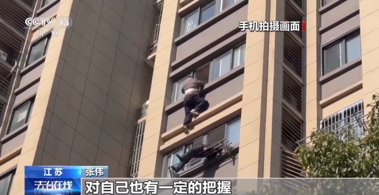 张伟:老人家当时也在喊撑不住了,我就把两头全部系在我的腰上,做两重双保险,让两个保安员和一个在家的业主,三个人拉着我,缓缓下坠。因为我自身也是退伍军人,也经常锻炼,对自己也有一定的把握。