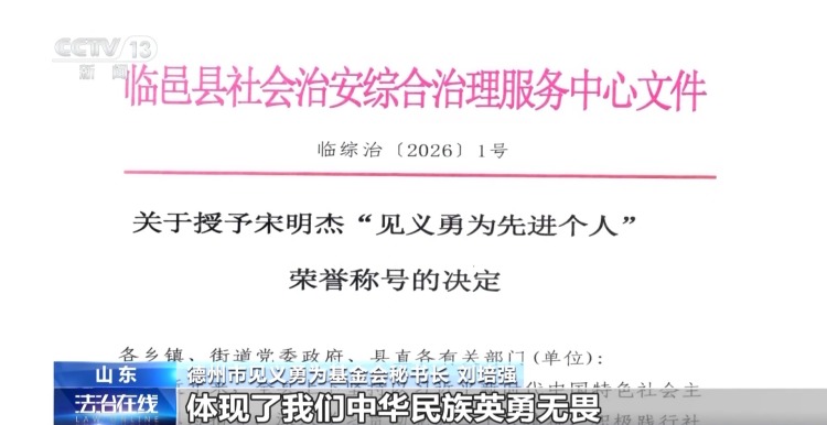 德州市见义勇为基金会秘书长 刘培强:宋明杰英勇救人的行为体现了中华民族英勇无畏、舍己为人、崇德向善的见义勇为精神。2月14日,经相关认定程序后,确认宋明杰救人行为属于见义勇为。