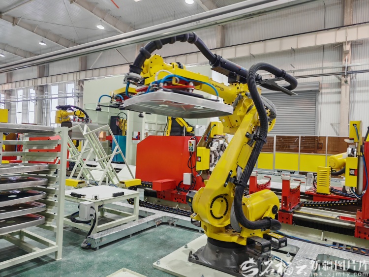 走进已投产的中厚板容器载具中心,看不到传统工厂的忙碌景象,机器人智能焊装线、全自动开卷校平剪切线、自动化静电喷粉涂装线有序运转,整体自动化率超过85%。在冲压模具中心,智能立体仓库和AGV叉车实现物料精准配送,从原料到成品全程无需人工搬运。