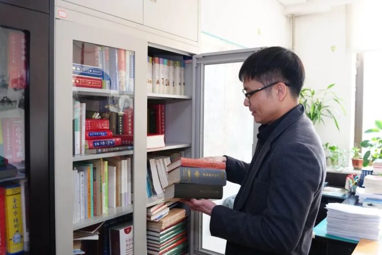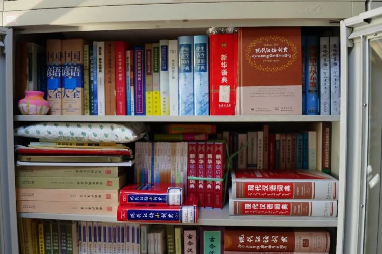 办公室书柜里的各种辞书。本报记者 崔家宁摄