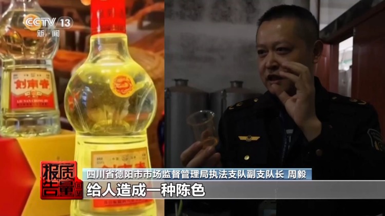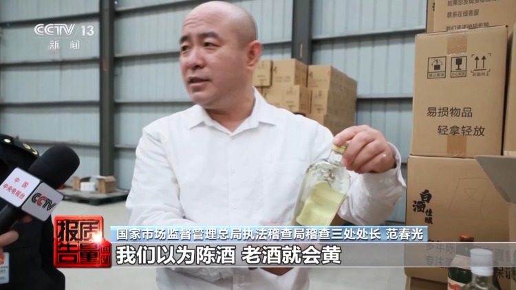 执法人员判断,这种发黄的酒体,很可能是违规添加色素调配而成,而并非真正存储时间久远的老酒自然本色。