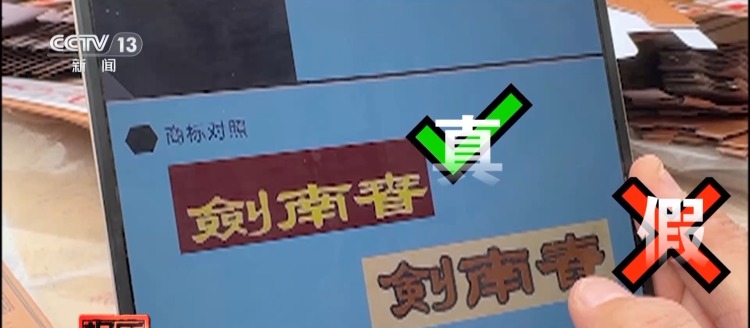 正宗的剑南春,“剑”字两个口中间是分开的。“南”字基本没有区别,“春”字就差一点点变形。执法人员认为,这样“打擦边球”式傍大牌仿冒产品,明显构成侵权行为。