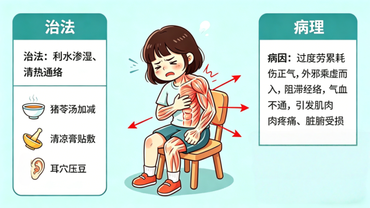 从中医视角来看,小琳的发病是因过劳耗伤正气导致湿热瘀浊内生,阻滞了经络、壅遏三焦水道,从而肌肉酸痛、小便不利,甚则会影响脏腑气化功能。因此治疗以利水渗湿、清热通络、养阴护正为原则。杨洞洞表示,治疗中,医疗团队选用猪苓汤加减,配合清凉膏贴敷、耳穴压豆,以清利湿热、疏通经络,缓解肌肉酸痛,恢复水液代谢,保护脏腑功能。